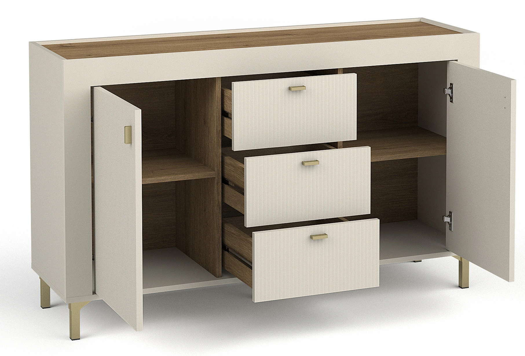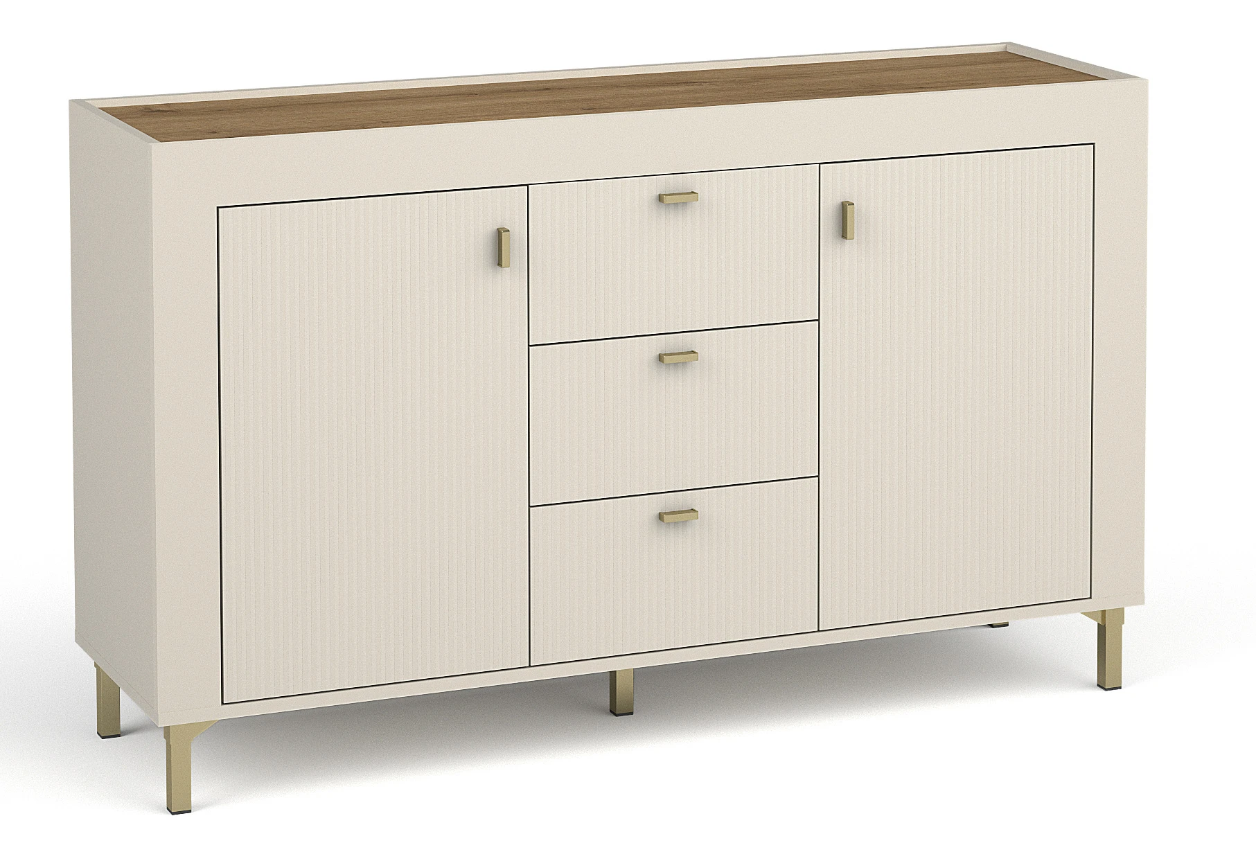 Novinka v kolekci Mossa! Tato stylová dvoudveřová komoda se třemi zásuvkami je dokonalým řešením pro váš obývací pokoj. Elegantní design v kombinaci s funkčností dodá vašemu interiéru nový charakter. Konstrukce o rozměrech 137,3x40x83,6 cm poskytuje dostatek úložného prostoru, který je ideální pro uložení různých předmětů. Komoda vyrobená z laminované desky v barvě kašmírového a whisky dubu se hodí do moderního i klasického uspořádání. Objednejte si ji nyní a užijte si eleganci a praktičnost v jednom!