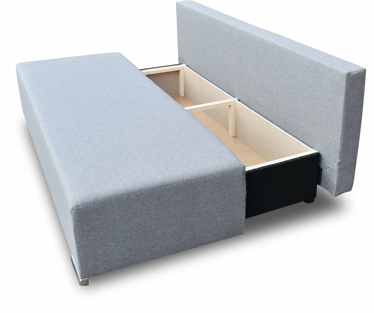 Vďaka tejto funkcii môžete pohovku jednoducho a rýchlo premeniť na pohodlné manželské lôžko. Stačí vybrať vankúše, mierne zdvihnúť prednú časť sedačky, vysunúť ju a spustiť. Potom sklopte operadlo a máte hotovo. Toto jednoduché riešenie neobmedzuje kapacitu úložného priestoru na posteľnú bielizeň a nepoškriabe podlahu.