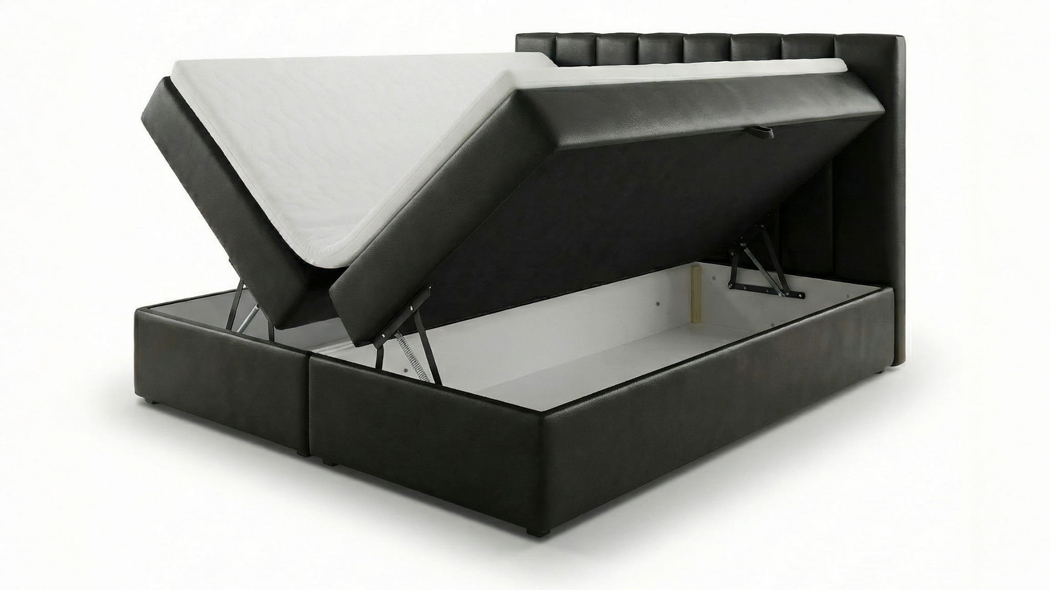 Dva priestranné úložné priestory umožňujú pohodlné uloženie prikrývok, vankúšov a textílií na dosah ruky, pričom mechanizmy držia sedaciu časť v hornej polohe po otvorení, čím zabezpečujú bezpečný a pohodlný prístup bez rizika náhleho spadnutia a úrazu. Ide o riešenie, ktoré zvyšuje komfort, bezpečnosť a funkčnosť postele, najmä v moderných domácnostiach.
