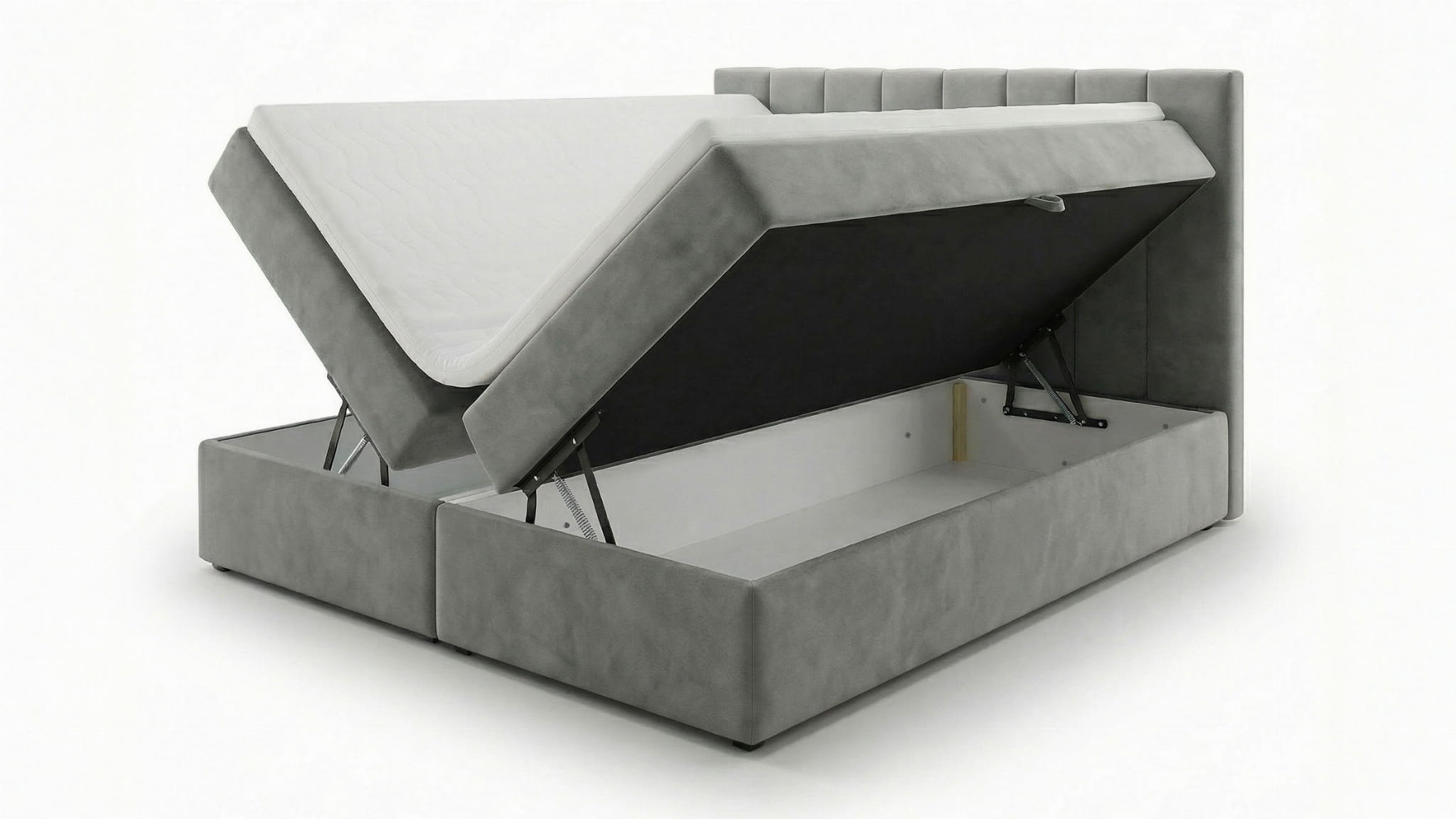 Dva priestranné úložné priestory umožňujú pohodlné uskladnenie prikrývok, vankúšov a textílií na dosah ruky a použité mechanizmy držia sedaciu časť v hornej polohe po otvorení, čím zabezpečujú bezpečný a voľný prístup k úložným priestorom bez rizika náhleho spadnutia a úderu. Ide o riešenie, ktoré zvyšuje komfort, bezpečnosť a funkčnosť postele, obzvlášť dôležité v moderných bytoch.