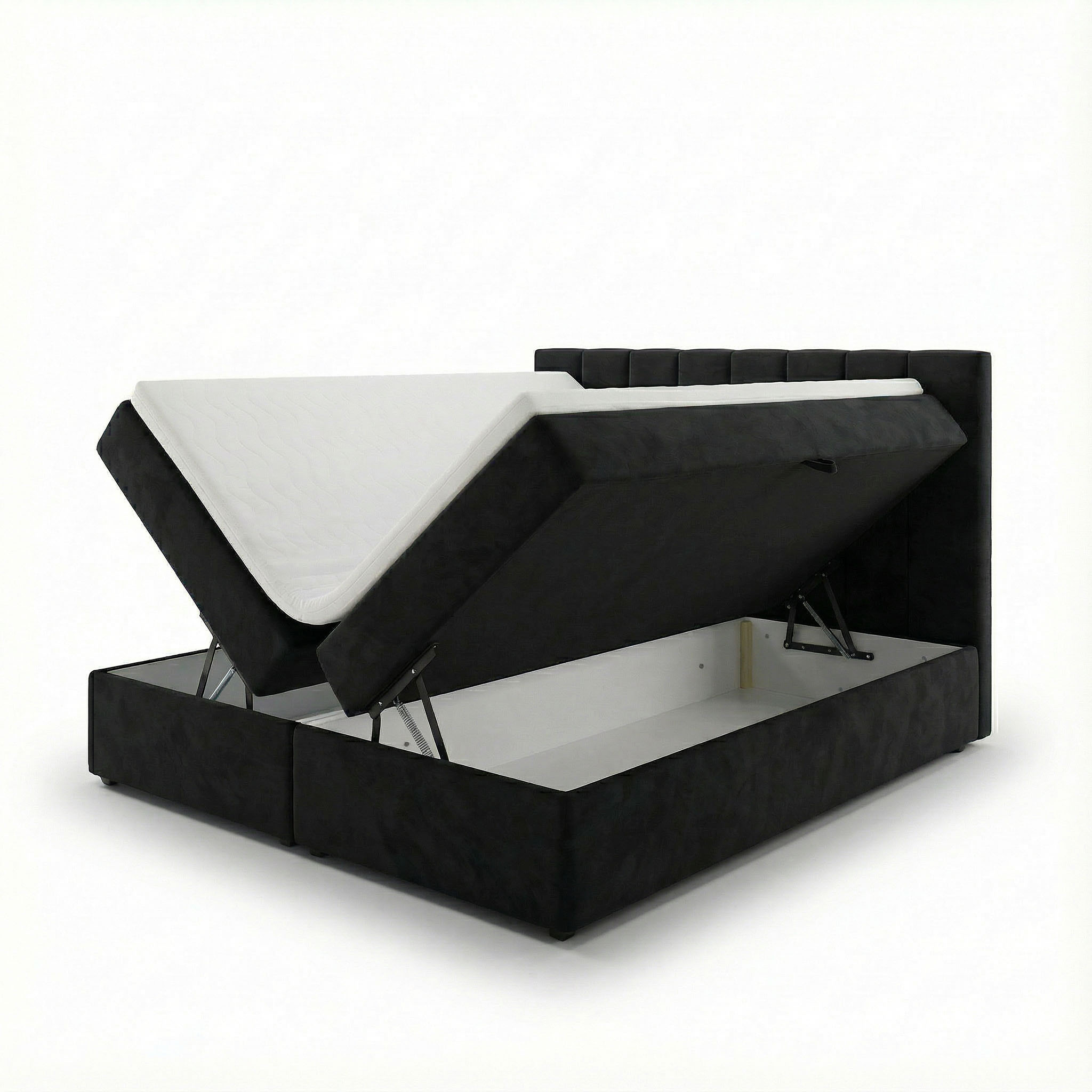 Dva priestranné úložné priestory umožňujú pohodlné uskladnenie prikrývok, vankúšov a textílií na dosah ruky a použité mechanizmy držia sedaciu časť v hornej polohe po otvorení, čím zabezpečujú bezpečný a voľný prístup k úložným priestorom bez rizika náhleho spadnutia a úderu. Ide o riešenie, ktoré zvyšuje komfort, bezpečnosť a funkčnosť postele, obzvlášť dôležité v moderných bytoch.