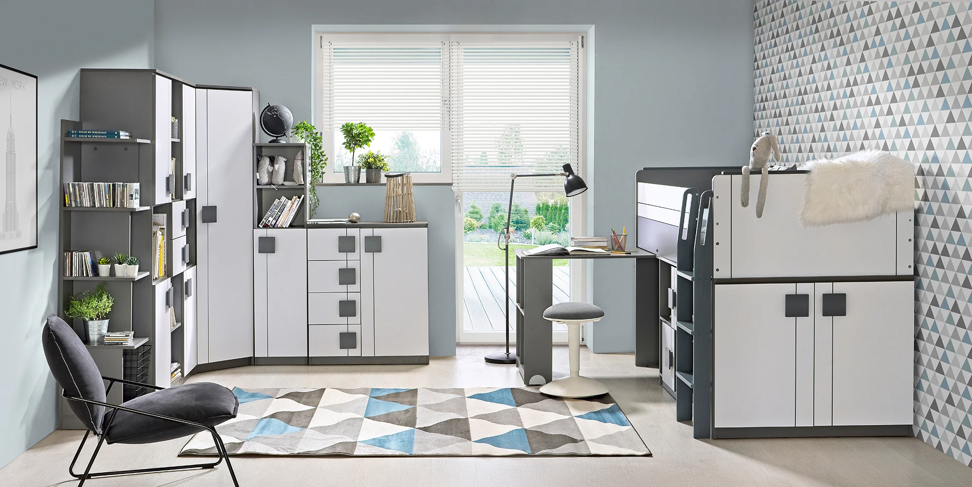 Predstavujeme vám systém nábytku Gumi, komplexné riešenie na zariadenie izby pre mladých alebo spálne, ktoré spája funkčnosť s moderným štýlom. Skladá sa z 19 rôznych kusov vrátane priestrannej šatníkovej skrine, knižníc, komôd, písacích stolov, postelí a poschodovej postele so vstavanou skriňou a písacím stolom. Celá súprava je zachovaná v harmonickom farebnom prevedení, kde korpusy v antracitovej farbe kontrastujú s bielymi čelami, čo dodáva interiéru elegantný a štýlový vzhľad. Estetiku nábytku Gumi navyše dotvárajú moderné úchyty v podobe ozdobných štvorcov, vďaka čomu je ideálnou voľbou do modernej izby pre mladých.