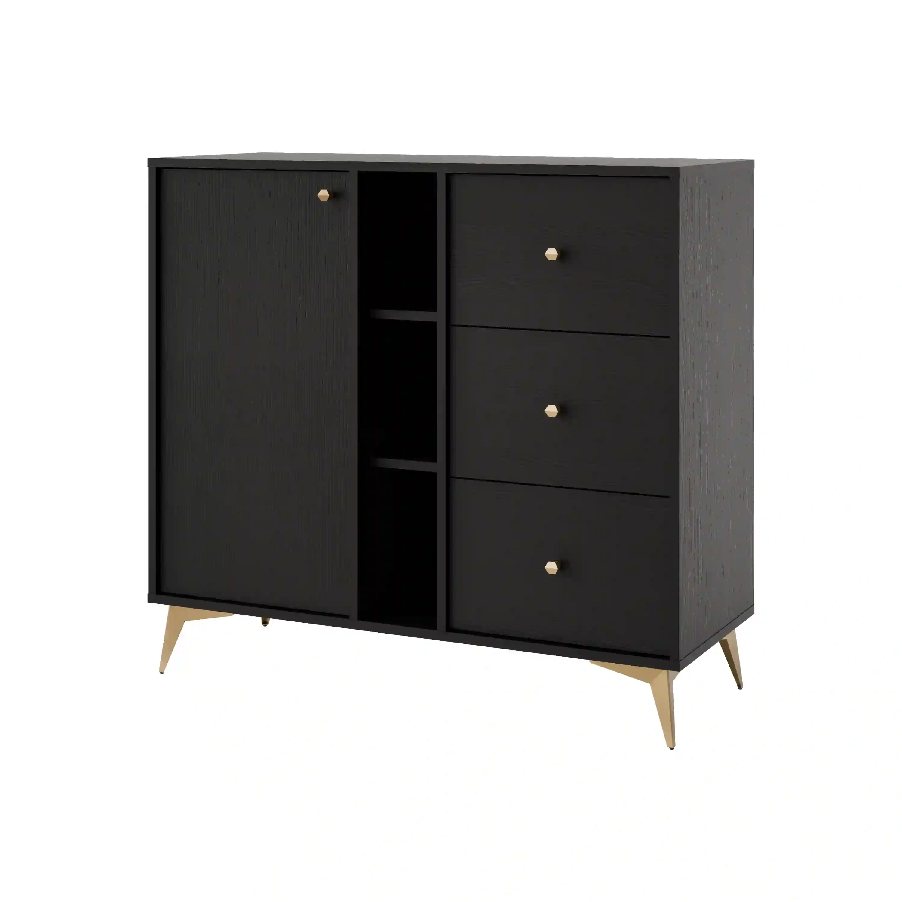 Funkčný nábytok so tromi zásuvkami, jednými dvierkami a dvomi otvorenými policami. Na vysokých zlatých kovových nohách, ktoré dodávajú ľahkosť. Dokončené zlatými kovovými úchytmi a jemnou štruktúrou čiel.