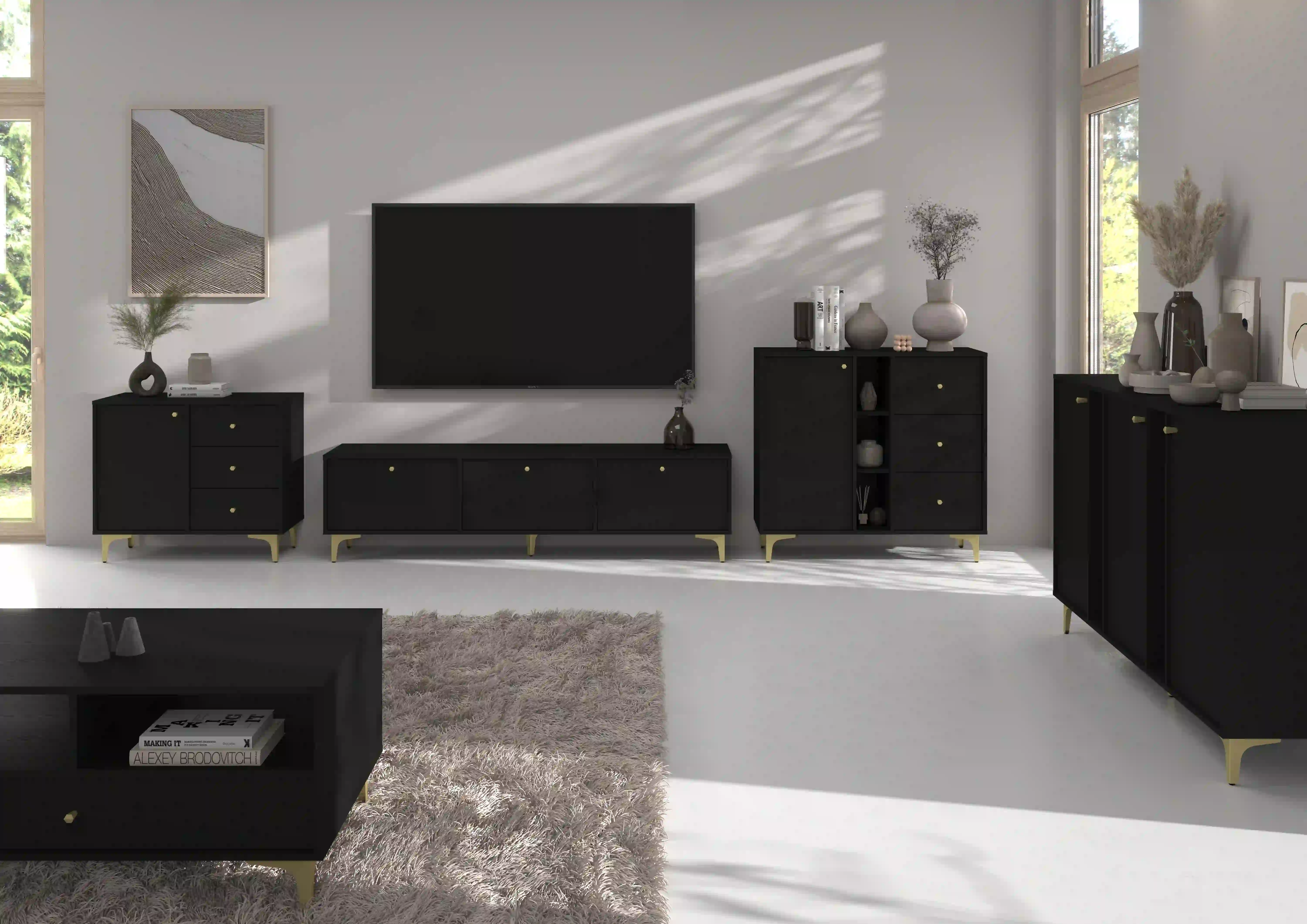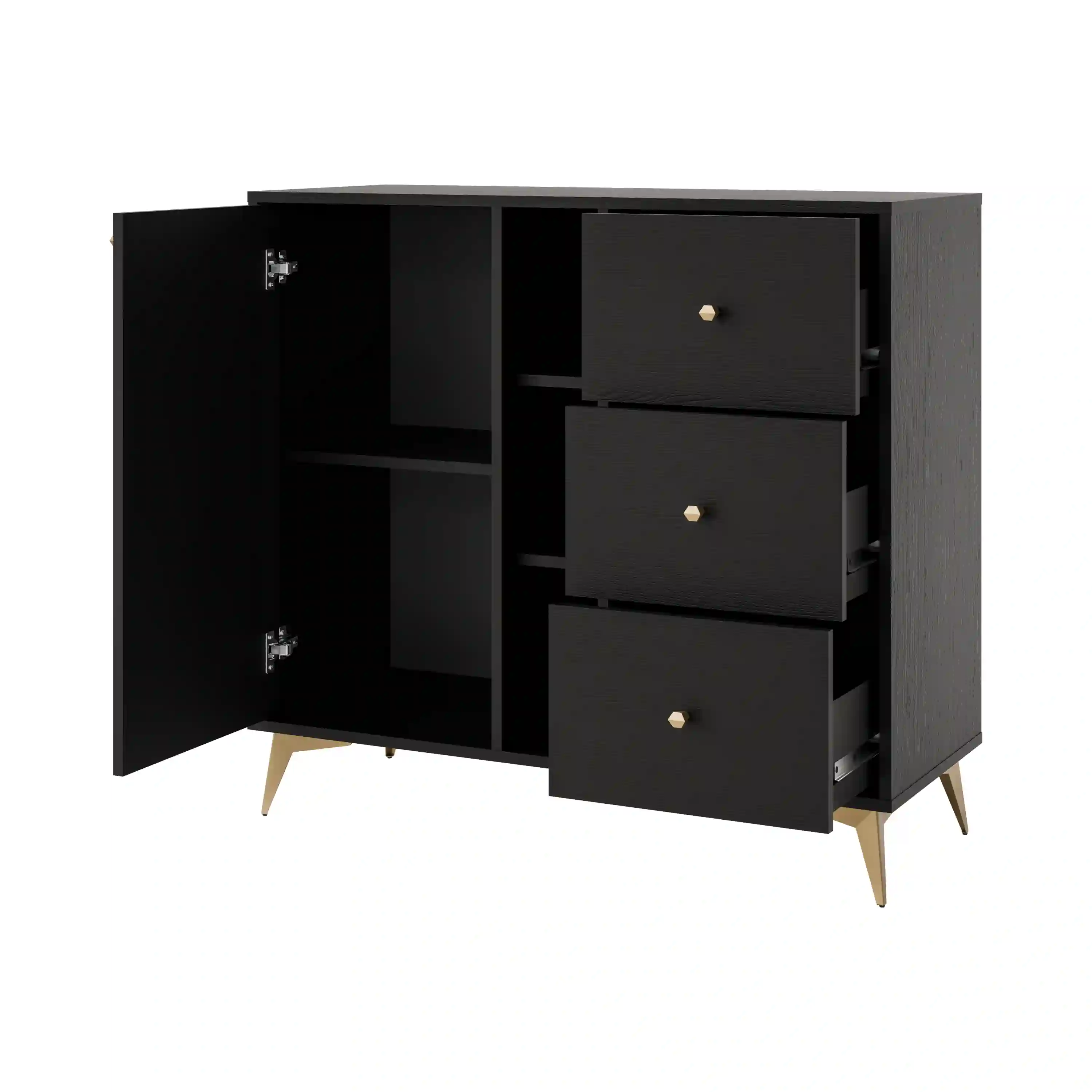 Ideálna ako doplnkový úložný priestor v obývačke či spálni. Otvorené police umožňujú prezentáciu dekorácií, zatiaľ čo uzavretá časť a zásuvky pomáhajú udržať poriadok. Zlaté detaily jej zároveň dodávajú dekoratívny charakter.