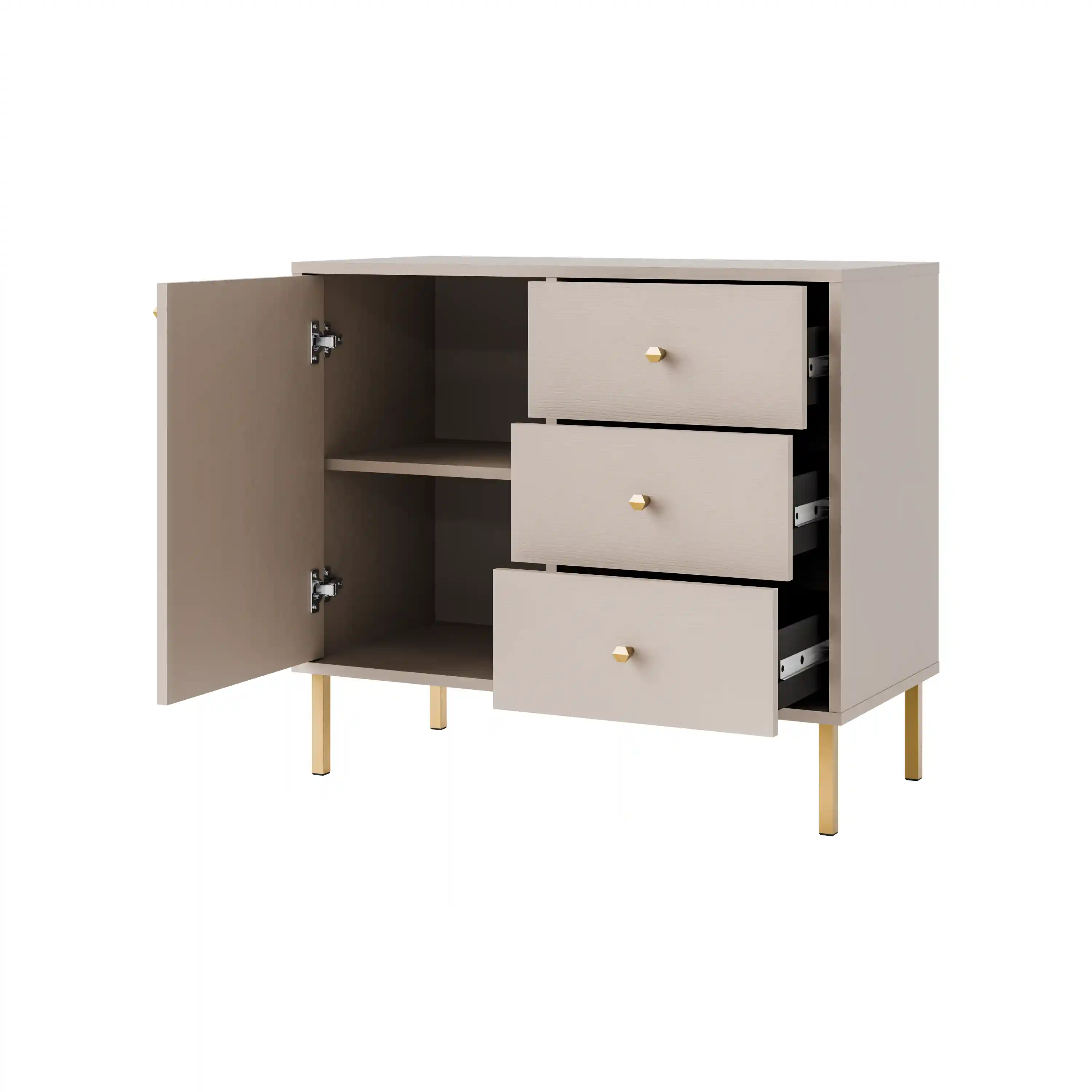 Štýlová komoda na zlatých kovových nohách spája moderný vzhľad s funkčnou konštrukciou. Disponuje tromi zásuvkami, jednými sklopnými dvierkami a jednou vnútornou policou, čo umožňuje pohodlné usporiadanie rôznych predmetov. Zlaté úchyty dodávajú eleganciu a podčiarkujú charakter celej kolekcie. Praktický kúsok do obývačky, predsiene či spálne.