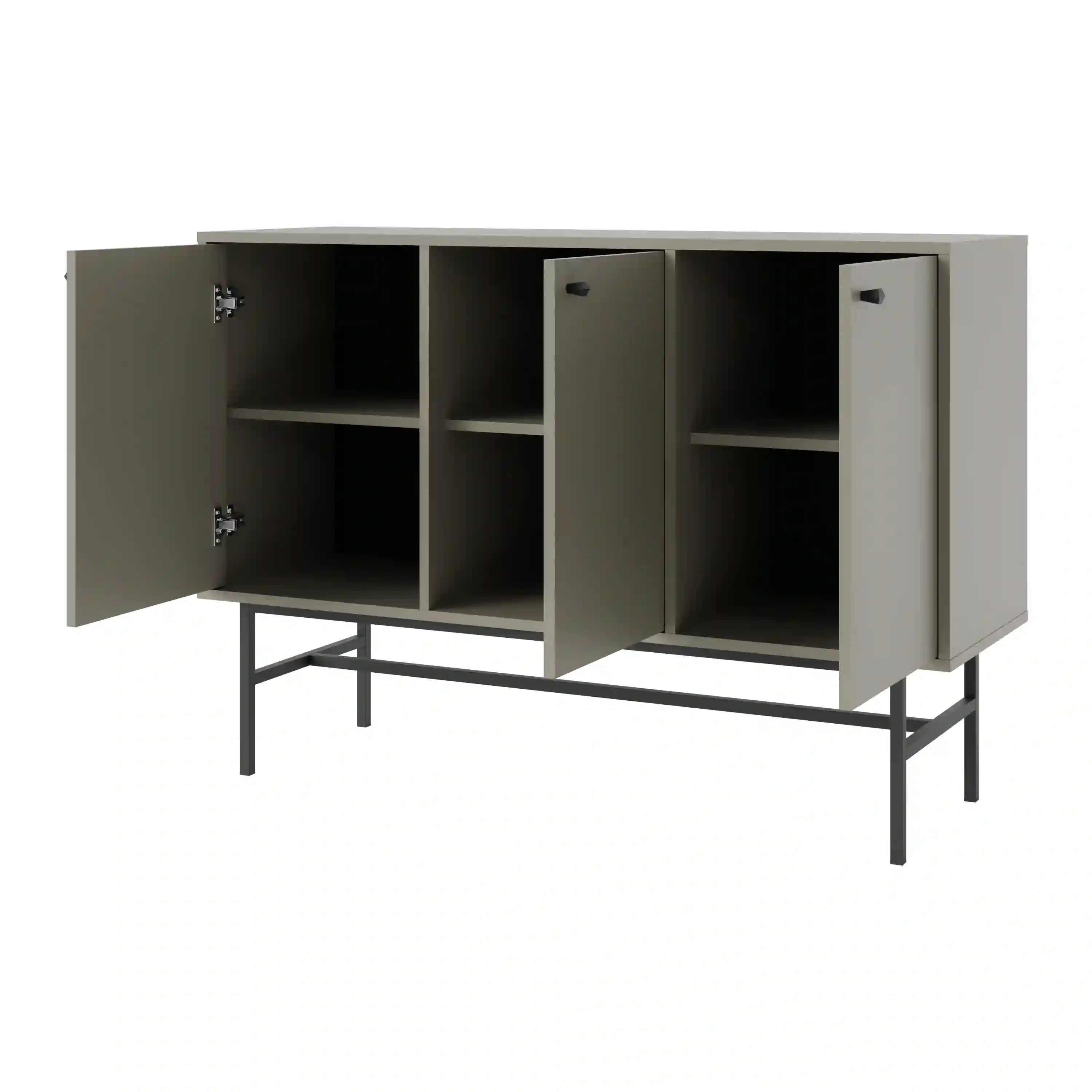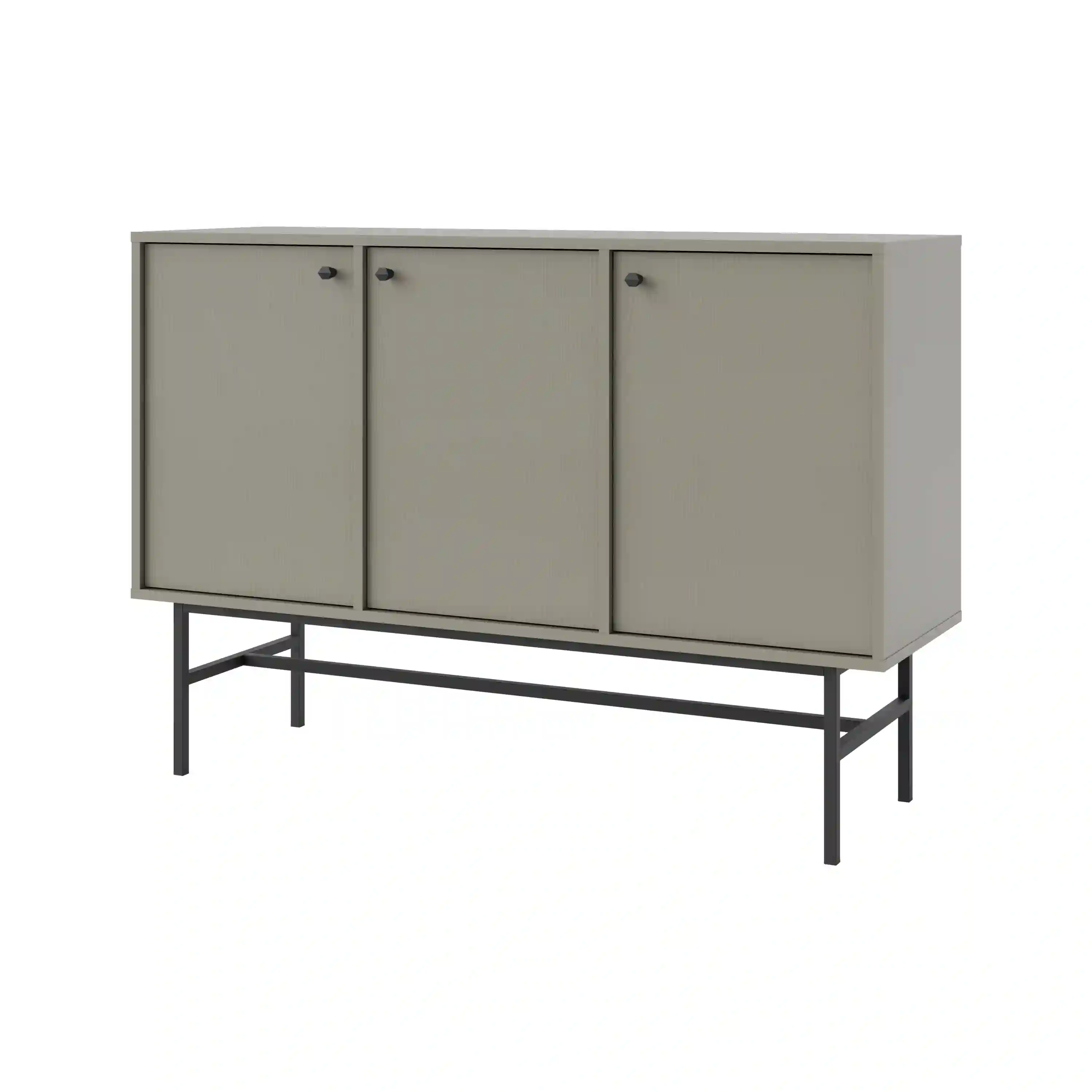 Funkčná komoda s tromi dvierkami, ktoré poskytujú uzavretý priestor na uskladnenie. Vo vnútri sú tri police, ktoré uľahčujú organizáciu a poriadok a ponúkajú dostatok miesta na rôzne predmety. Čierne kovové gombíky dodávajú moderný charakter a trvácnosť.