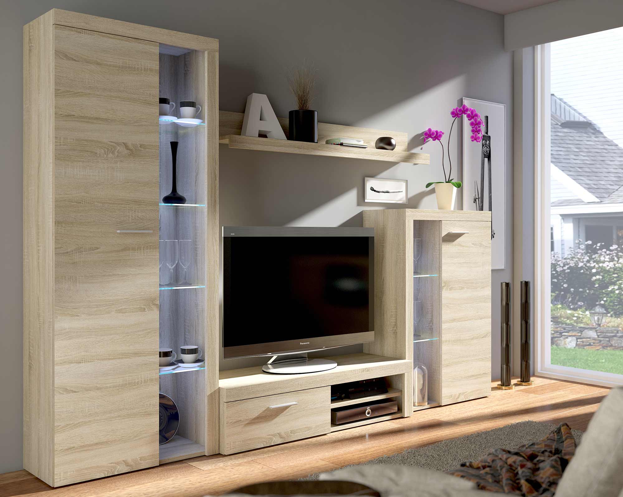 Súprava nábytku Rumba má všetko, čo by mala mať moderná nástenná skrinka. Centrom zostavy nábytku do obývačky je skrinka RTV so šírkou 120 cm. Tá je dostatočne široká na to, aby sa do nej zmestil veľký obývačkový televízor. Má dve otvorené police na umiestnenie satelitného dekodéra, blu-ray prehrávača alebo hernej konzoly. Vedľa nej sa nachádza praktická a priestranná skrinka na uloženie mnohých diskov s filmami, hudbou alebo hrami. Nad televízorom visí nástenná polica široká 140 cm. Je to vhodné miesto na rámik na fotografie, malú vázu alebo knihu. Po oboch stranách skrinky RTV sa nachádzajú pútavé vitríny. Veľká vitrína má päť otvorených políc, kde bolo namiesto drevenej dosky použité sklo. Menší kus nábytku má tri sklenené police. Je to ideálne miesto na vzácne spomienkové predmety, kryštály alebo dokonca šperky. Určite sa prvý pohľad vašich hostí obráti na súpravu Rumba.