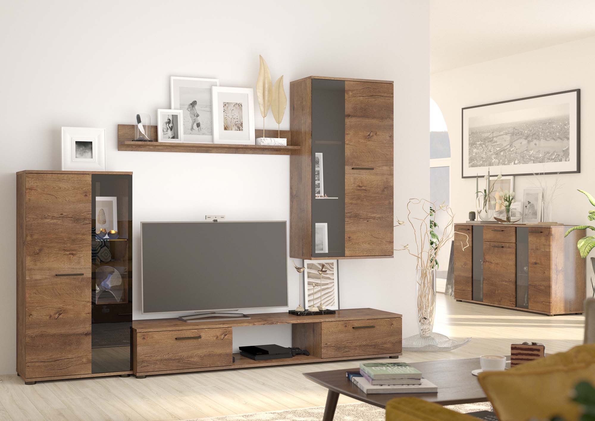 Polica je korunou nástennej jednotky, dokonale splýva s priestorom nad televízorom a rozhodne zvyšuje praktickosť súpravy. Môžete na ňu umiestniť svoje obľúbené knihy, fotografie svojich blízkych alebo dekorácie a obohatiť tak výzdobu obývačky.