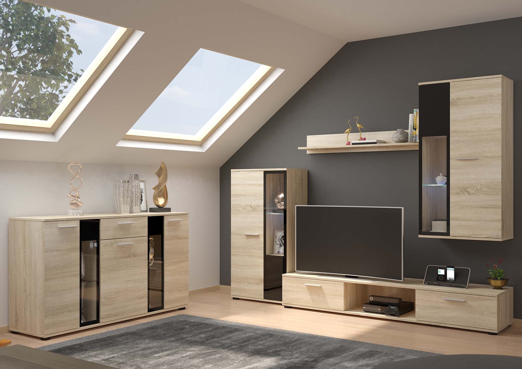 Súprava obsahuje dve skrinky s vitrínami, ktoré vylepšia každý interiér. Jedna z nich je klasická voľne stojaca vitrína, zatiaľ čo druhá sa montuje priamo na stenu nad skrinku RTV. Každá z vitrín má tri police s výklopnými dvierkami. Elegantné presklenie s tónovanými okrajmi a jedna polica dodávajú celku moderný vzhľad.