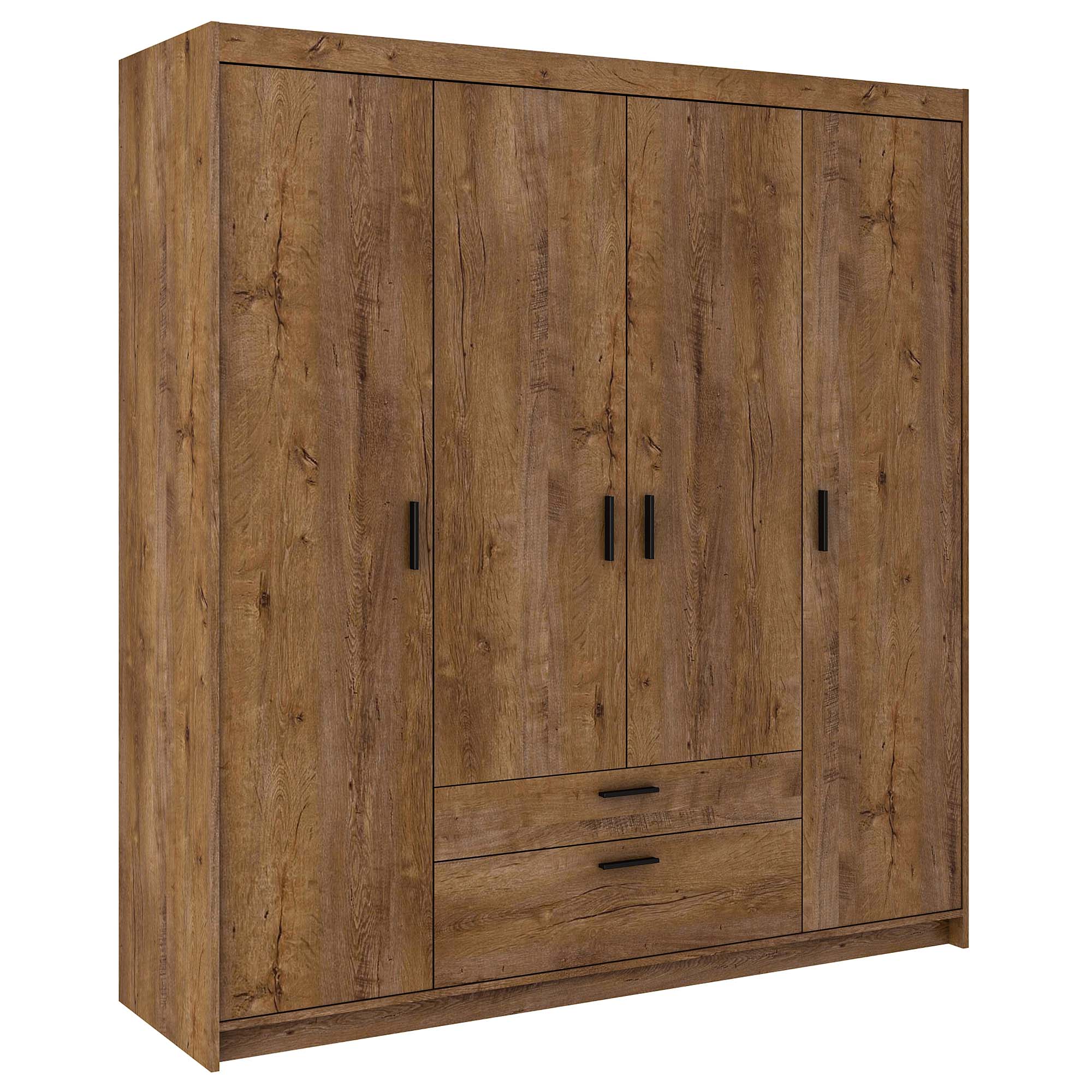 Na ľavej a pravej strane šatníka sa nachádzajú veľké dvere, ktoré sa dajú otvoriť na celú výšku šatníka. Za dverami sa nachádza vešiaková tyč a malá polica. Tu si môžeme uložiť šaty, obleky alebo košele. V strednej časti nábytku sa nachádzajú štyri priestranné police a pod nimi dve zásuvky. Štvordverová šatníková skriňa Elena má teda dostatok priestoru a je len na vás, čím ju chcete zaplniť!