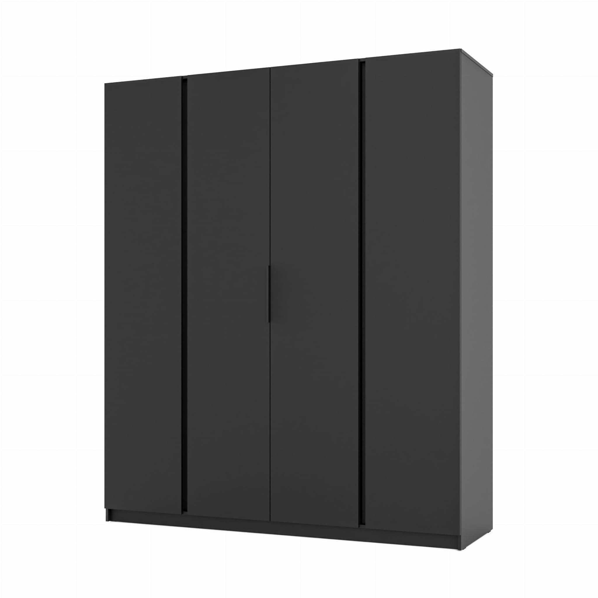 Šatníková skriňa DRAVERO BL/BL 4F je moderný kus nábytku, ktorý zaujme svojou minimalistickou estetikou. Hladké čierne čelá dodávajú interiéru eleganciu a nadčasový vzhľad. Premyslené vnútorné usporiadanie kombinuje štýl s funkčnosťou, vďaka čomu ponúka dostatok miesta na oblečenie, posteľnú bielizeň a doplnky.